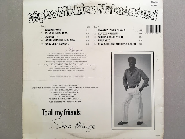 $ 0 0 Sipho Mkhize Nabaduduzi – Phansi ImikhontoLP Gallo [BL 587] (1987)Composer, Producer, Arranger, Engineer - Sipho MkhizeEngineer - Ian McMurray, Tom MayburyPhotography - Athol FransSleeve Design - Teri ZListen here or here