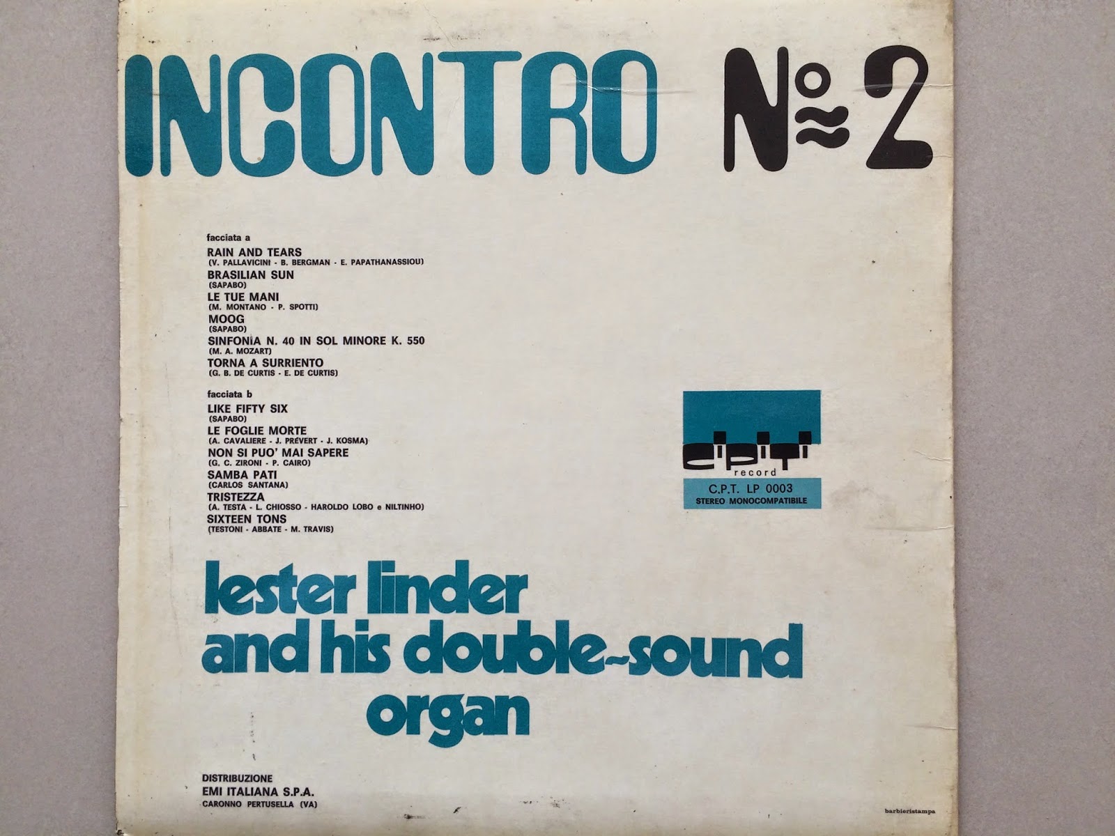 $ 0 0 Lester Linder And His Double-Sound Organ – Incontro N° 2LP Cipiti Record [C.P.T. LP 0003] (197x)Performer, Conductor, Composer, Arranger - Sante PalumboBuy it here